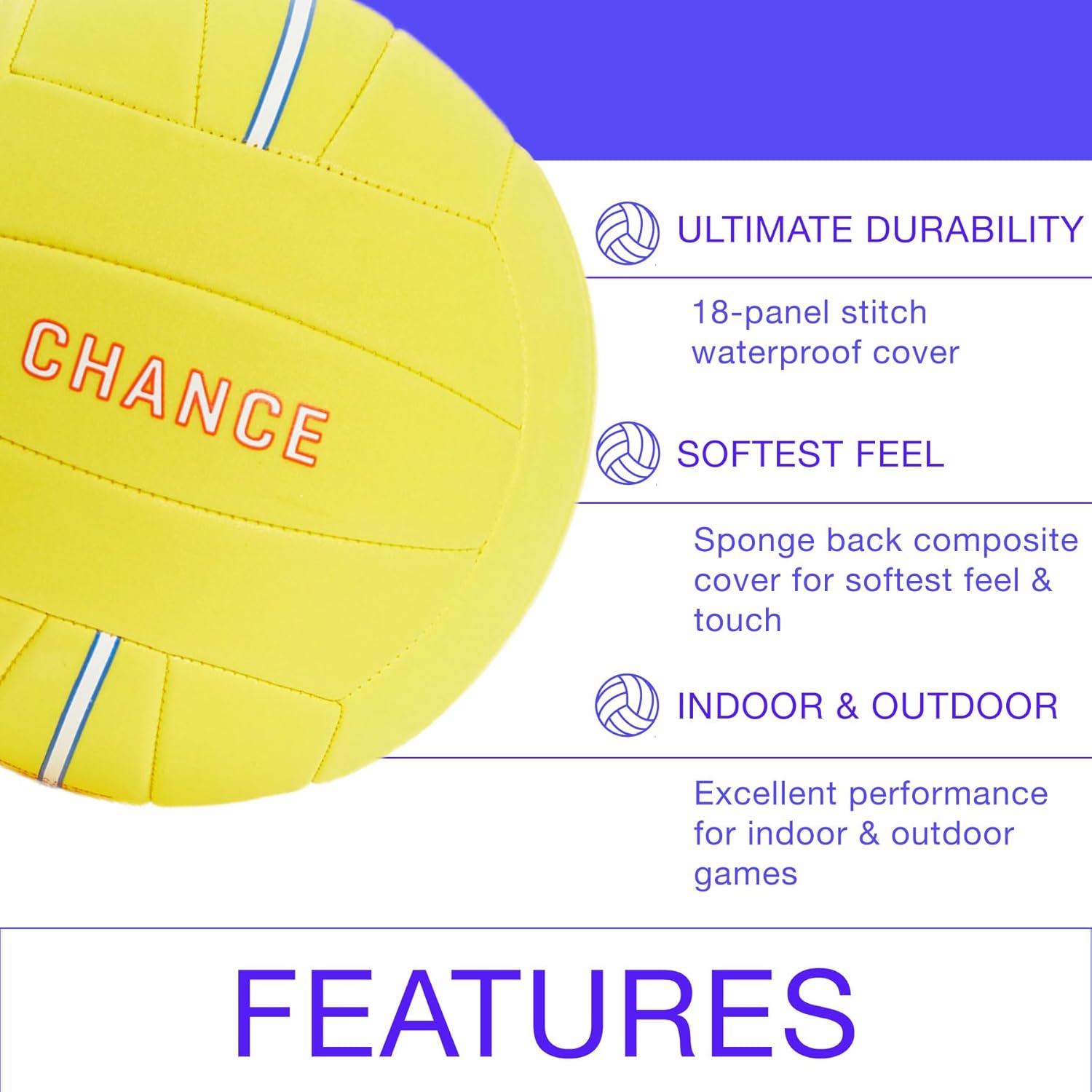 The CHANCE Soft Volleyball has colorful & durable 18-panel stitched construction and a soft foam backed composite leather cover, for a soft feel, super-soft touch & light play. Excellent performance for indoor practice & play, but also waterproof making ideal for outdoor use at the beach, pool, park or in your own backyard. A butyl bladder locks in air for optimal ball pressure and shape, enabling a solid strike every time (ball comes deflated, air pump and inflation needle NOT included). The best addition to your volleyball training equipment so you can become the next beach volleyball all-star!! How often do you lose or confuse your beach balls? Not with Chance. Our unique colorful volleyball designs will make yours standout! Perfect volleyball gifts for teen girls & volleyball fans.