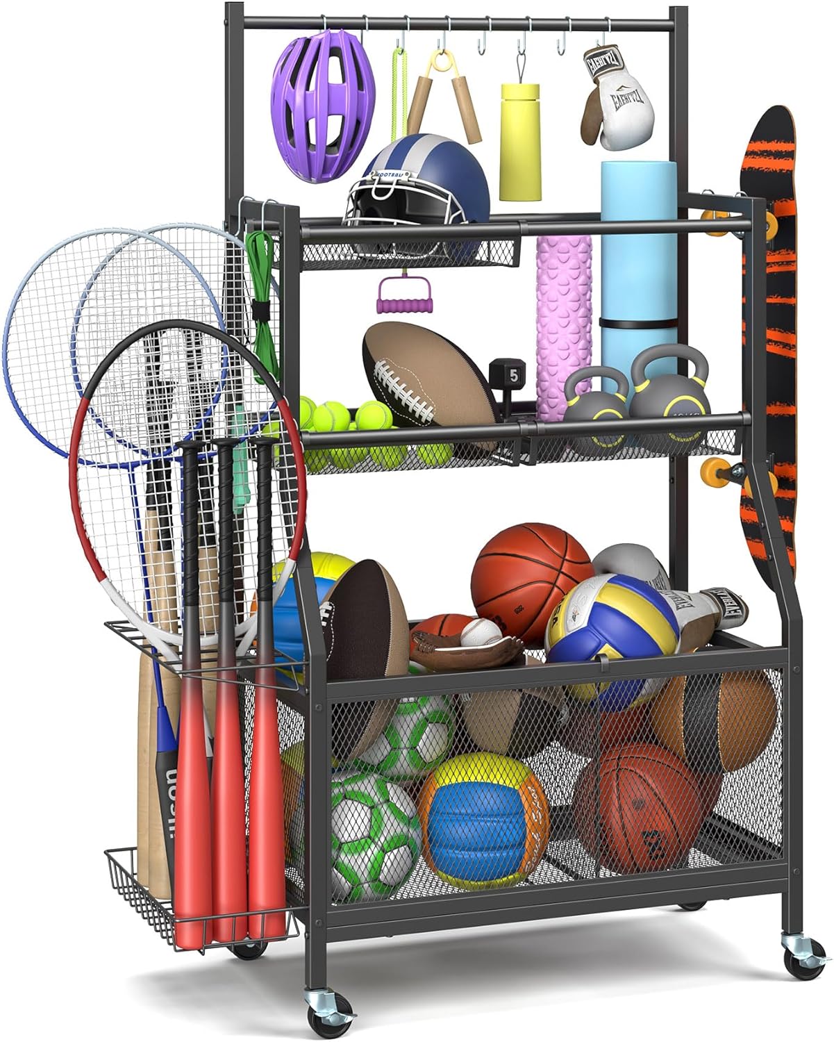 Mr IRONSTONE Garage Sports Equipment Organizer with Wheels, Heavy Duty Steel Garage Ball Storage Rack with Hooks and Baskets, Rolling Garage Organizers and Storage for Sports Gear Toy Indoor & Outdoor