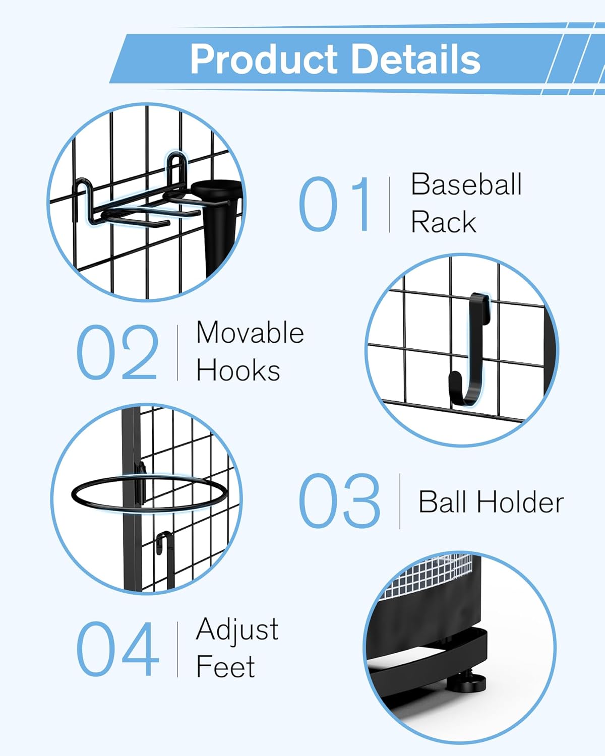 【Adjustable Feet】: The sports rack is equipped with adjustable feet. It can makes the rack stand straight in the garage, basement or bedroom or whatever surface it’s on.
