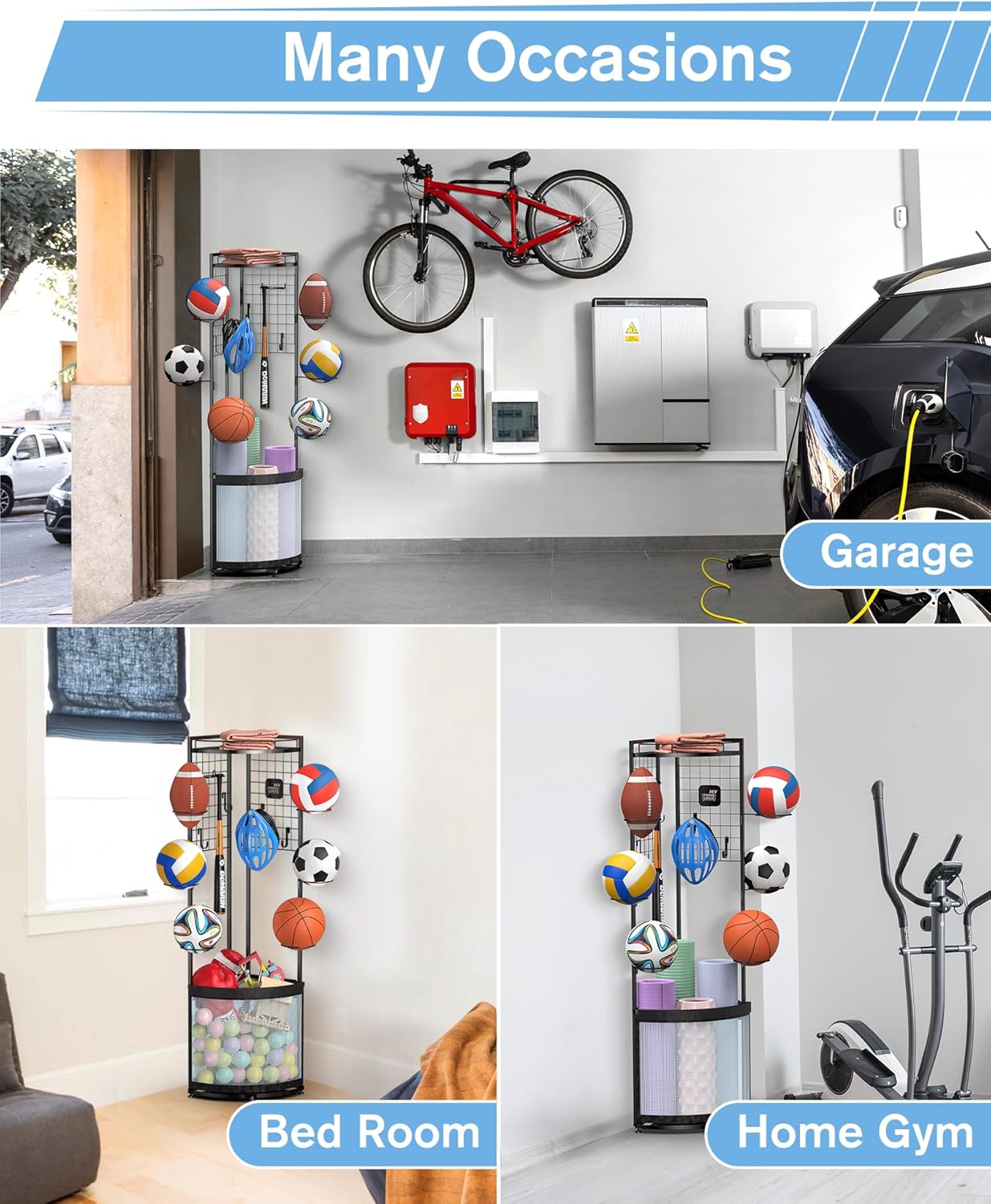 【Vertical Ball Rack】: The ball holder was designed to be vertical and can organize a various of sports balls including basketballs, soccer balls, footballs, volleyballs and fitness gears and kids toys.