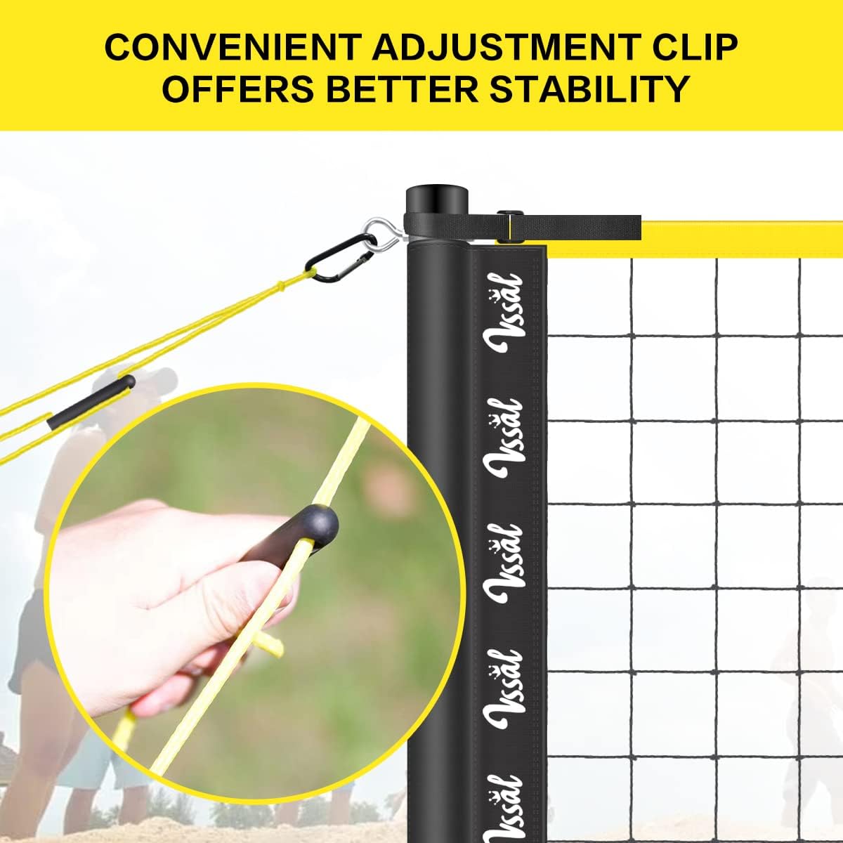 No Base Needed + Hook and Loop Tighten the Net: Get rid of base, with steel stakes, set official volleyball set to the lawn, backyard or beach. The volleyball set is equipped with hook and loop fastener to easily adjust the tension of the net to keep the top and bottom net remains taut and straight. No more droopy net. No mechanical failure