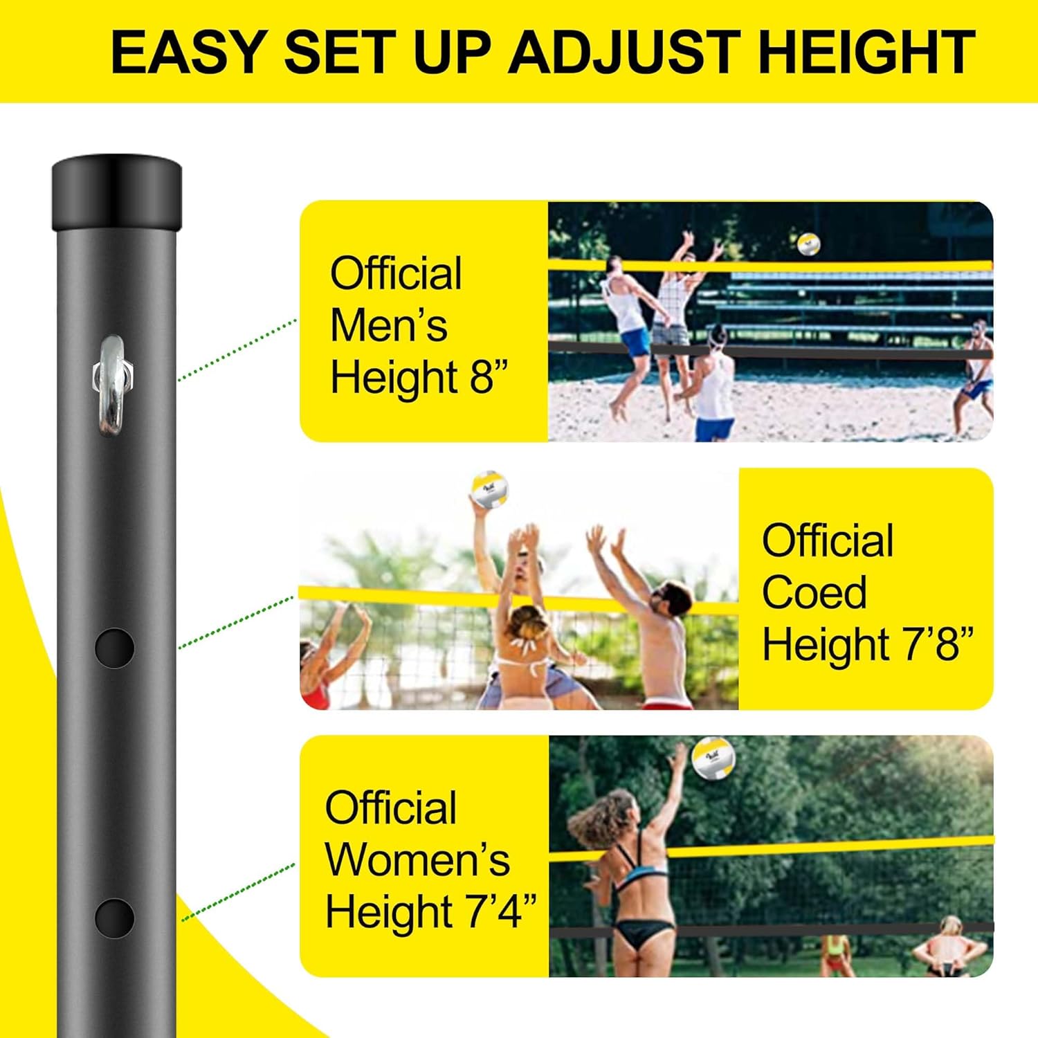 Adjustable Height: 8 x powder-coated steel poles measured 1.5’’ in diameter are strong enough to offer maximum stability. Easy to choose a volleyball nets outdoor height with the push-button locking system. 3 height options: men’s(8”), co-ed (7’8”) and women’s (7’4”) playing heights