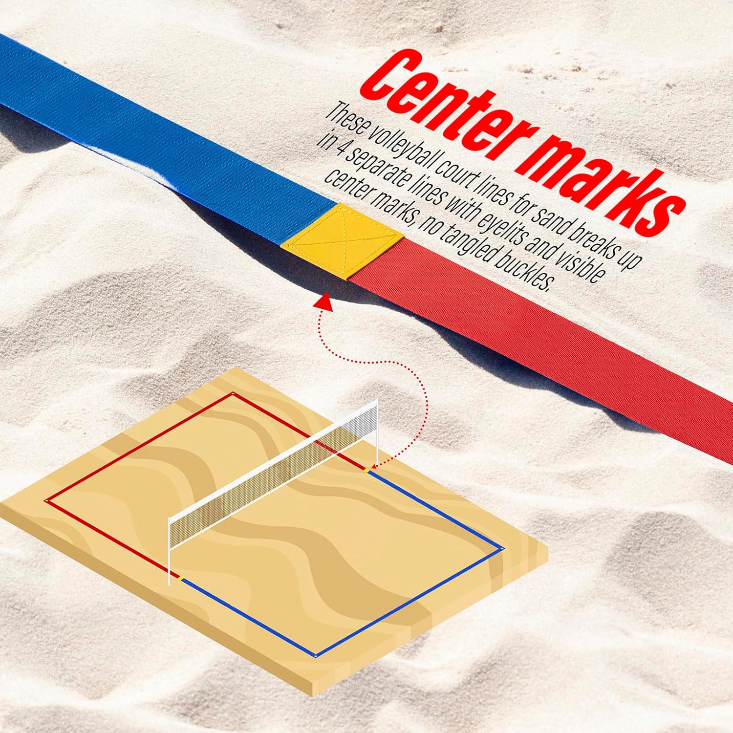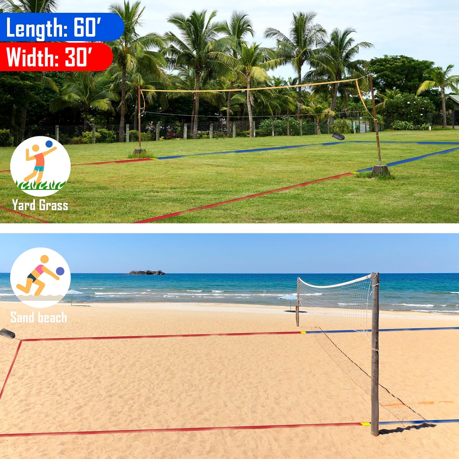 【Simple to Install】Doubles sand volleyball lines is the newest design, quick and easy to set up- no tangling! Comes with 4 sand bags and 4 stainless stakes along with an installation guidebook