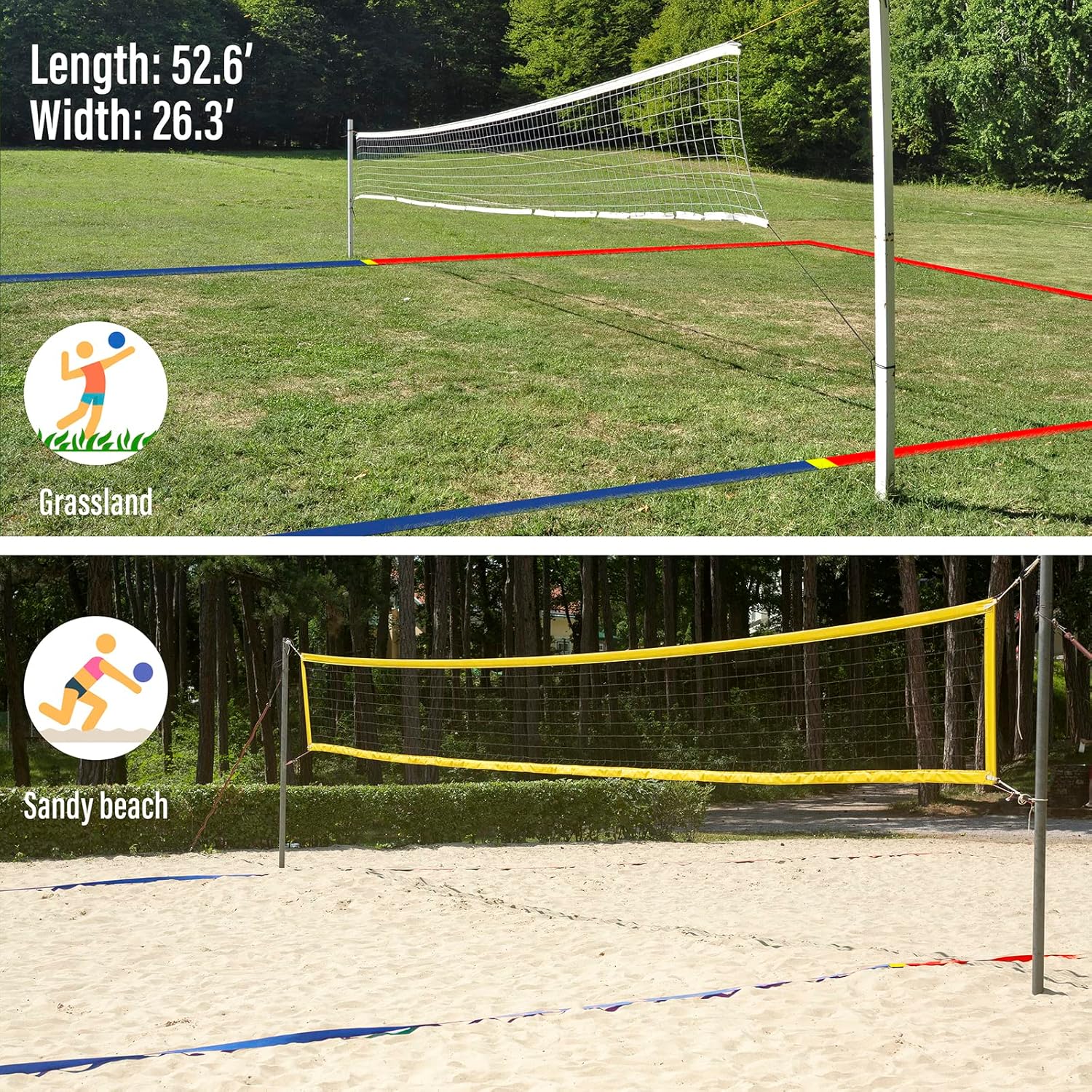 【Easy to Set up】Beach volleyball court lines for sand is 2022 newest design, not tangle, simply install it in a short time; 4 sand bags used for beach and 4 stainless stakes used for grass; The instructions will help you more