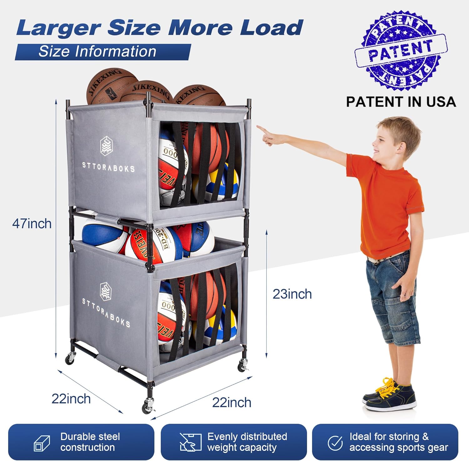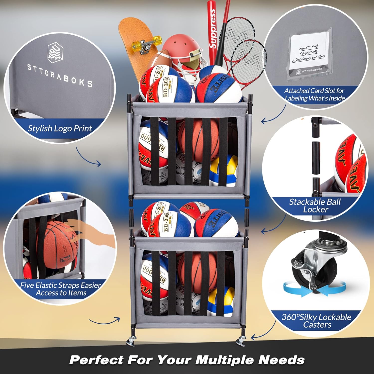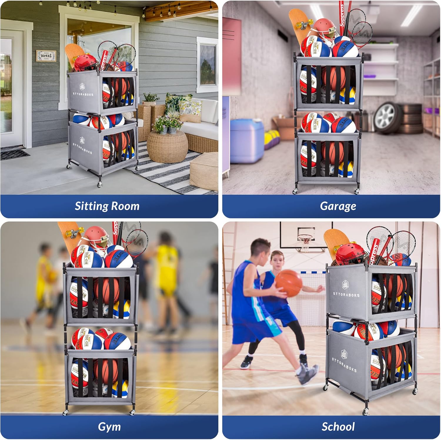 Large Capacity Stackable Ball Cart: This ball storage cart comes with two carts that evey cart has a larger capacity, capable of holding four standard size basketballs flat on one level. Equipped with connecting tubes ,you can stack them together to increase storage space and reduce floor space. Designed to save space and maintain an organized and efficient environment. It’s a long-term solution for cleaning up the clutter, perfect for garages and houses.