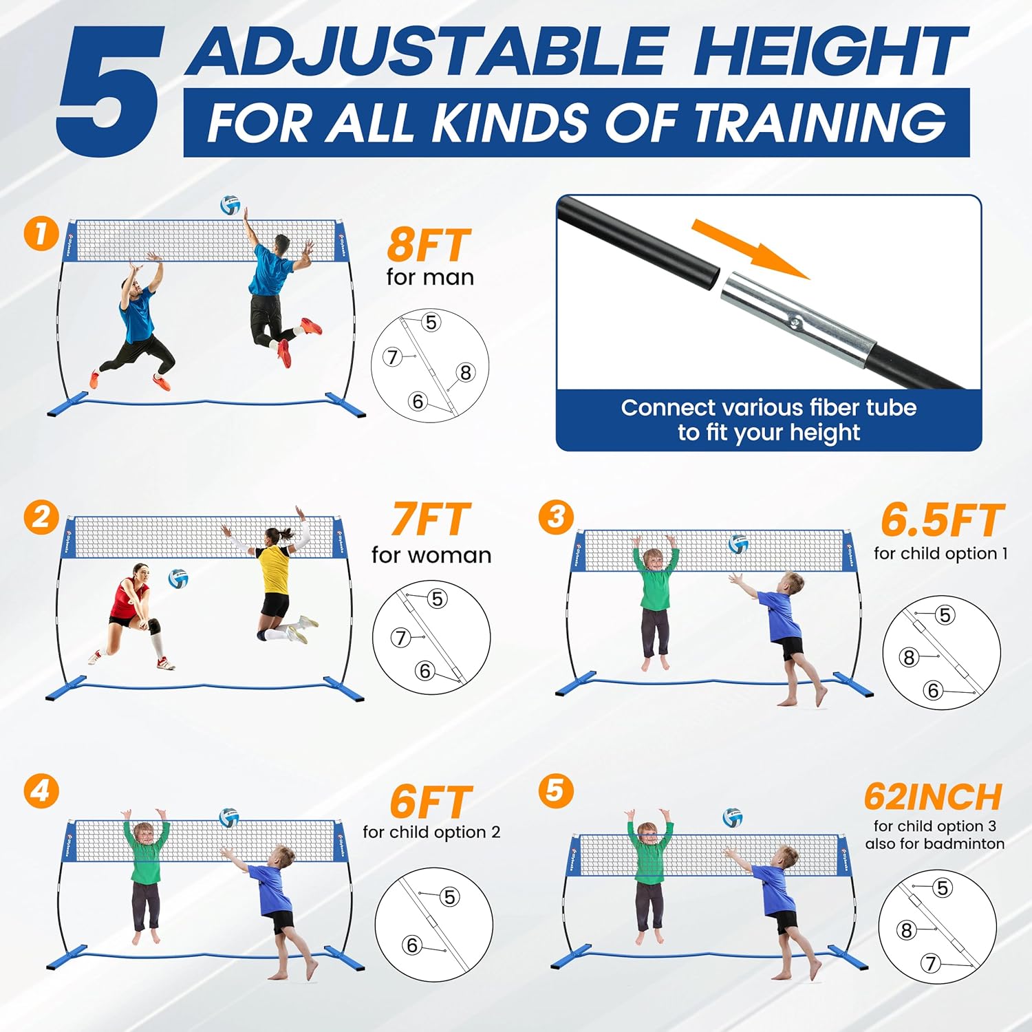𝐌𝐨𝐫𝐞 𝐇𝐞𝐢𝐠𝐡𝐭𝐬 𝐎𝐩𝐭𝐢𝐨𝐧𝐬: different sizes of fiberglass tube work together to achieve 4 volleyball heights such as 8 feet for male, 7.4 feet for female, and 6.5 feet and 6 feet for kids. According to operation manual, they are easily adjusted to train for needs of various ages and technical levels. Special height: 62 inches is our minimum height, and somewhat higher height which is especially designed to badminton playing or training.