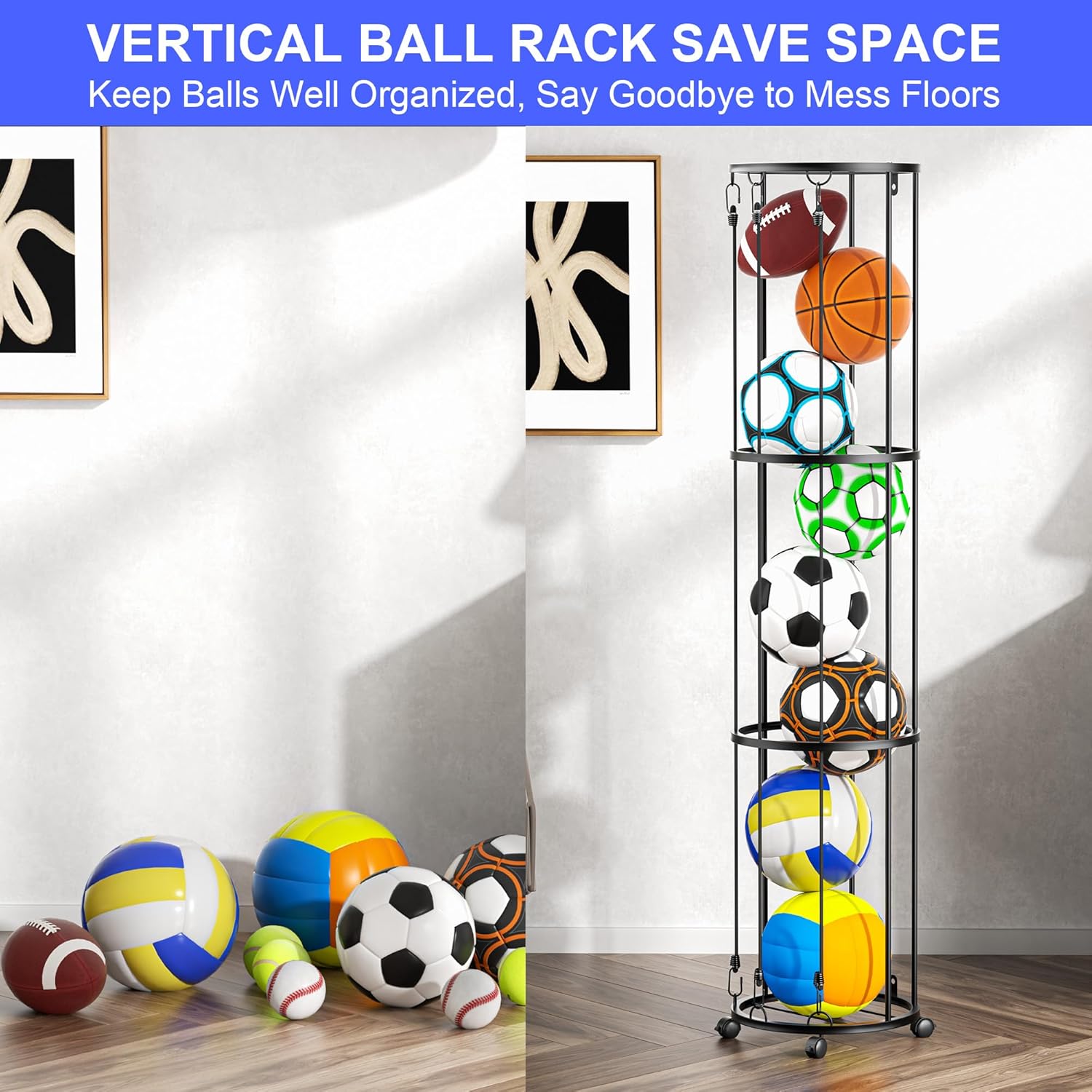 Enough Storage Space: This garage sports equipment organizer use columnar vertical design to saving your organize area and increase the storage space. Sports rack can hold eight balls like basketball, soccer, volleyball, football and other balls. Say goodbye to messy floor, keep a neat and organized space