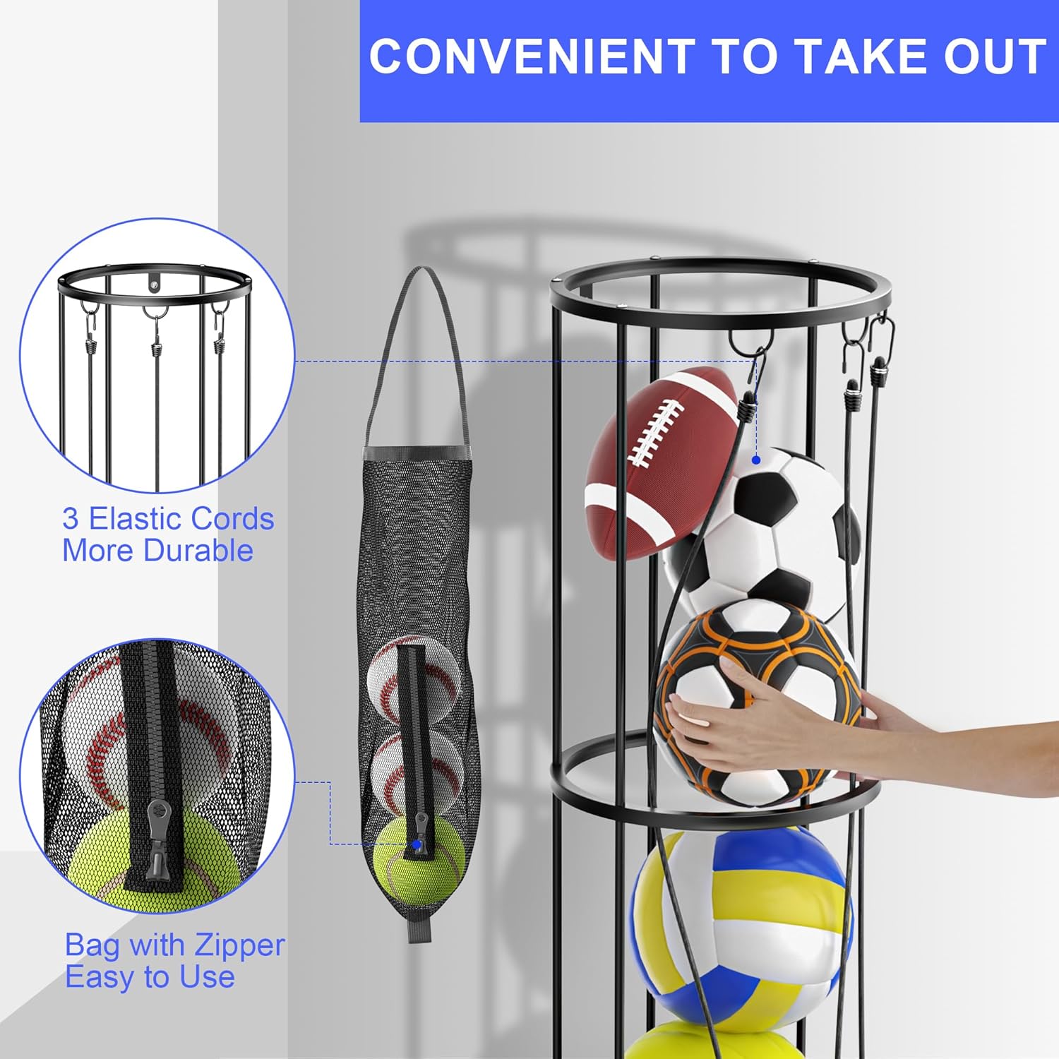 Easy to Access: Ball rack comes with 3 adjustable elastic cords on the front of the basketball holder, you can store and take out the sports balls by adjusting the elastic rope easily, 3 elastic cords can lock the balls inside tightly. The hollow and visible design makes it easier for you to find your needed ball, more time to enjoy sports