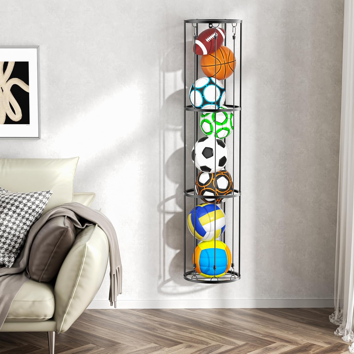 Sturdy and Durable: This ball holder dimensions is diameter 13in and 58.5in height can holds roughly 8-9 different sport balls, keep your sports equipment organizer and access easily. Basketball racks for balls is made of high quality metal, durable enough for daily use and it only need take a few minutes to install
