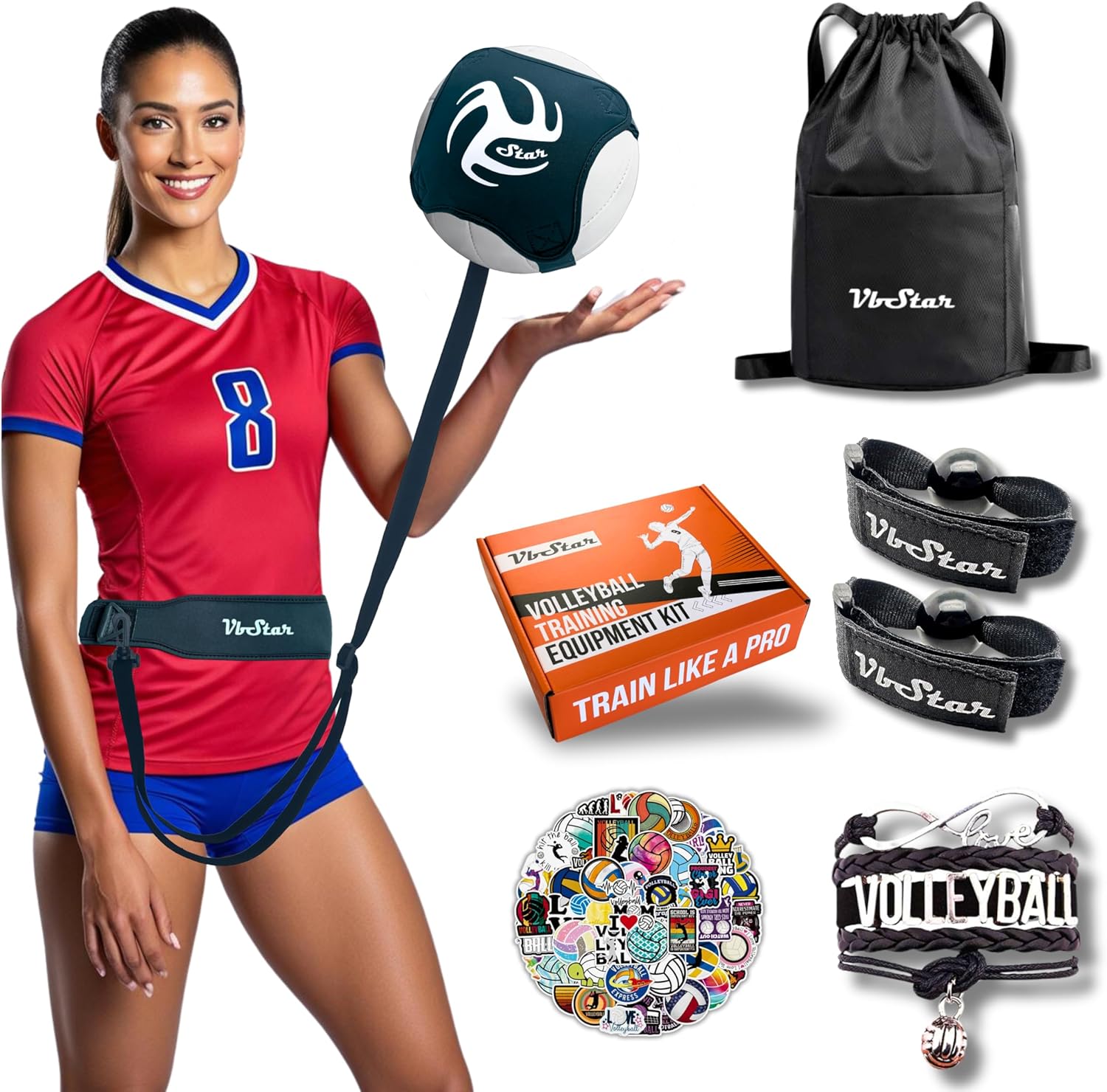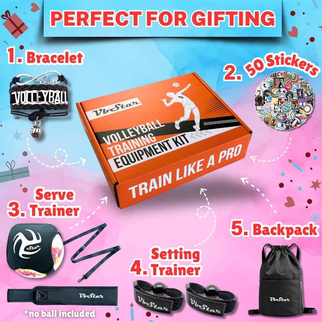 Perfect Gift Set for Volleyball Lovers – Packaged in a stylish box, this set includes the VbStar Volleyball Serve Trainer, one setting trainer, one high-quality backpack, a cute volleyball bracelet, and 50 volleyball-themed stickers, making it the ultimate gift for any volleyball fan!